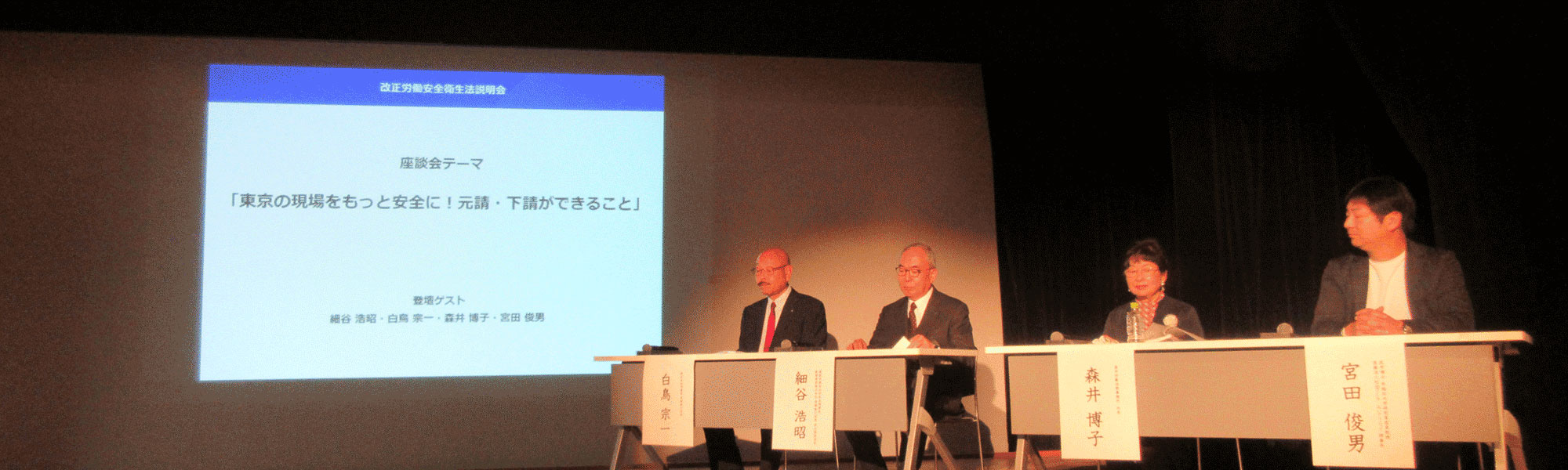 - 2025年12月16日、細谷理事長が新宿文化センターで行われた厚生労働省主催「改正労働安全衛生法説明会」の座談会に出席し、建設業の現状・課題そして今後の展望について発表しました。(2025.12)